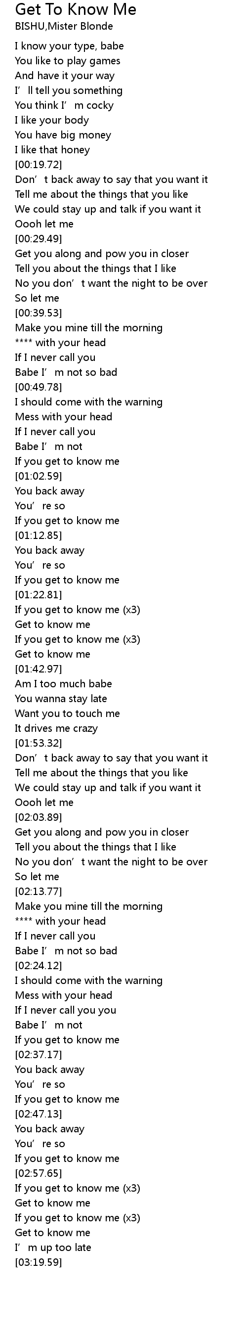 | [03:05.64] | Get to know me |