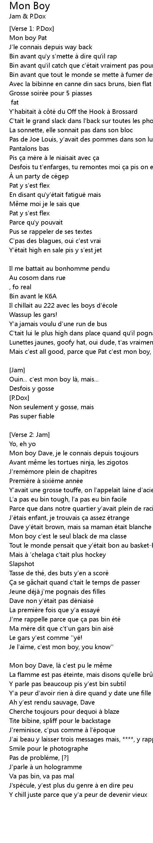 | Mais c' est all good, parce que Pat c' est mon boy, for real | |