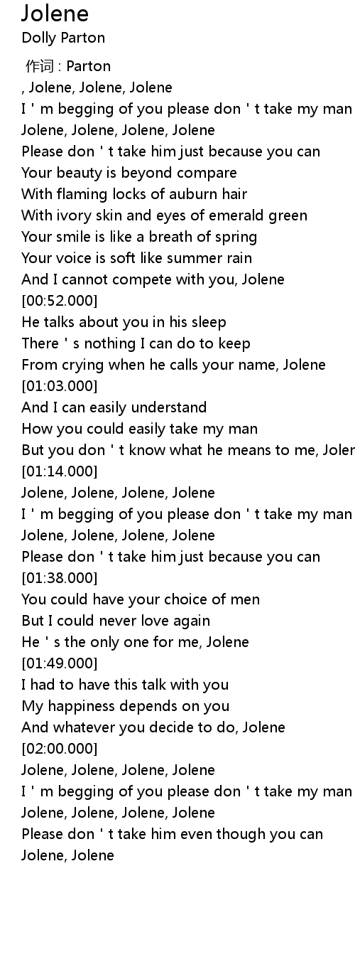 | [01:15.500] | Jolene, Jolene, Jolene, Jolene |