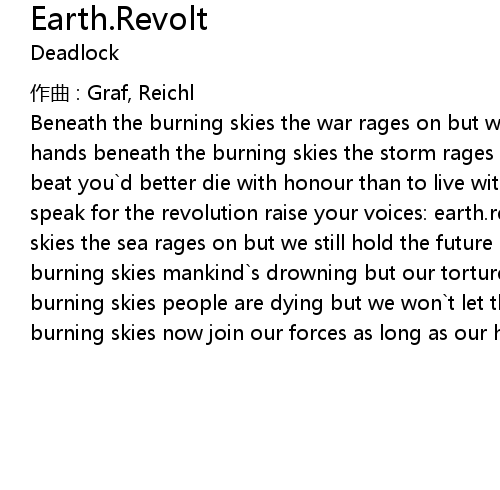 | Beneath the burning skies the war rages on but we still hold the future in our hands beneath the burning skies the storm rages on but our tortured hearts still beat you d better die with honour than to live with shame now let the earth speak for the revolution raise your voices: earth. revolt beneath the burning skies the sea rages on but we still hold the future in our hands beneath the burning skies mankind s drowning but our tortured hearts still beat beneath the burning skies people are dying but we won t let the earth die beneath the burning skies now join our forces as long as our hearts still beat |