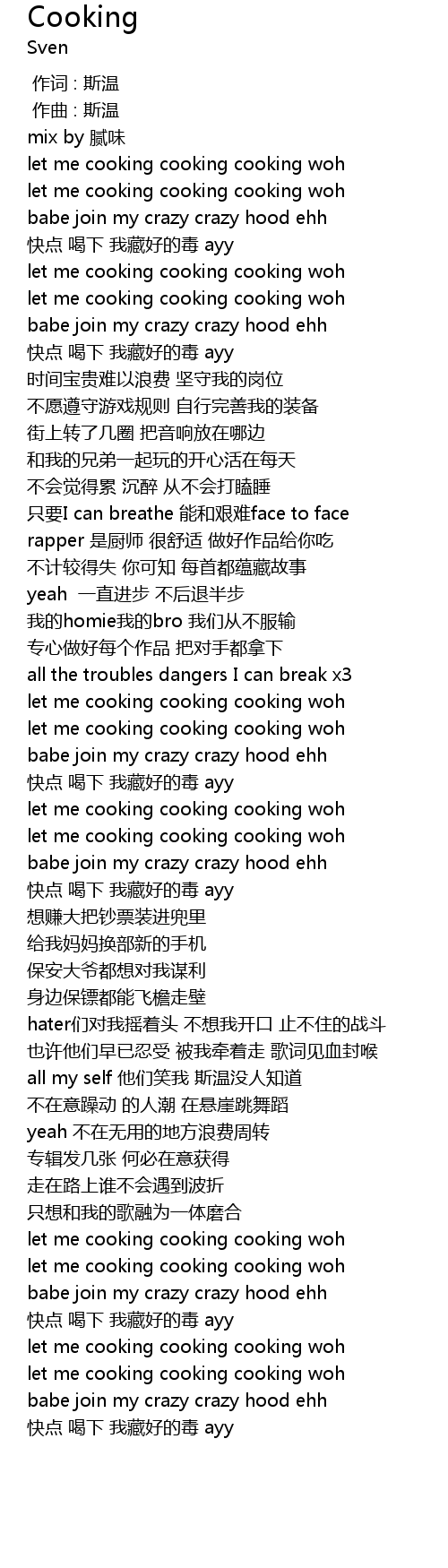 | [00:57.054] | rapper 是厨师 很舒适 做好作品给你吃 |