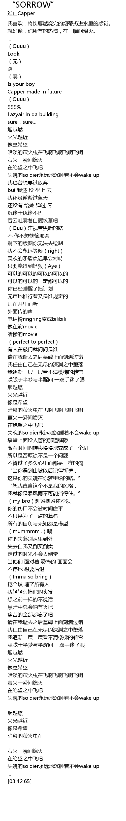 | [00:43.59] | 失魂的soldier永远地沉睡着不会wake up |