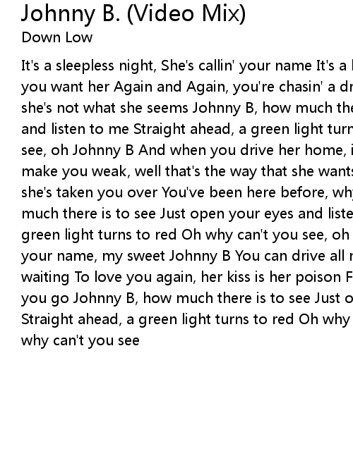 | It's a sleepless night, She's callin' your name It's a lonely ride, I know how you want her Again and Again, you're chasin' a dream yeah But Johnny my friend, she's not what she seems Johnny B, how much there is to see Just open your eyes and listen to me Straight ahead, a green light turns to red Oh why can't you see, oh Johnny B And when you drive her home, is she sittin' real close Does she make you weak, well that's the way that she wants you You're strung out again, she's taken you over You've been here before, why can't you let go Johnny B, how much there is to see Just open your eyes and listen to me Straight ahead, a green light turns to red Oh why can't you see, oh Johnny B And when she calls your name, my sweet Johnny B You can drive all night and you know she'll be waiting To love you again, her kiss is her poison Forever inside you, wherever you go Johnny B, how much there is to see Just open your eyes and listen to me Straight ahead, a green light turns to red Oh why can't you see, oh Johnny B Oh why can't you see |