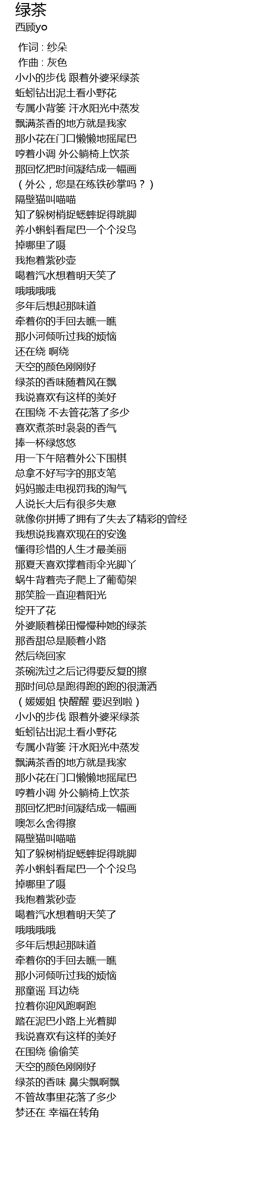 | [00:26.112] | 小小的步伐 跟着外婆采绿茶 |