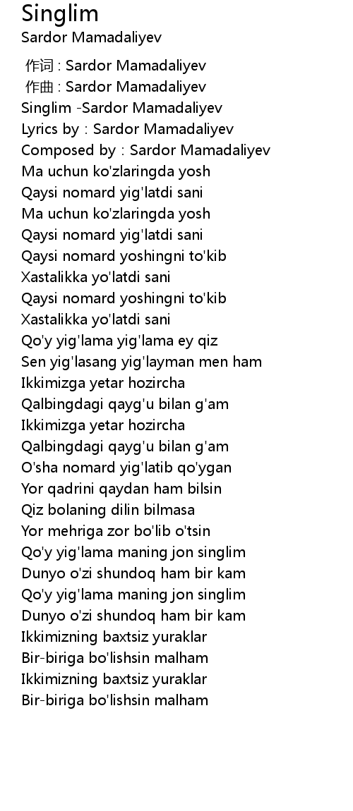| [00:00.461] | Singlim -Sardor Mamadaliyev |