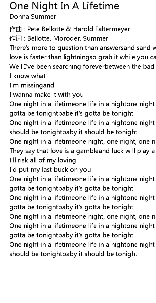 | One night in a lifetimeone life in a nightone night in a lifetimeand baby it' s gotta be tonightbaby it' s gotta be tonight | |