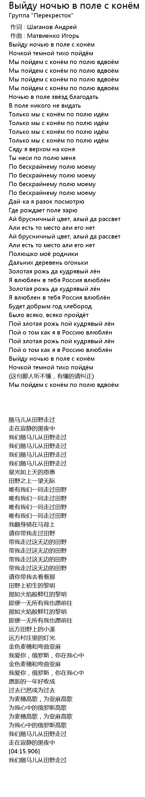 | 歌曲 | Выйду ночью в поле с конём |