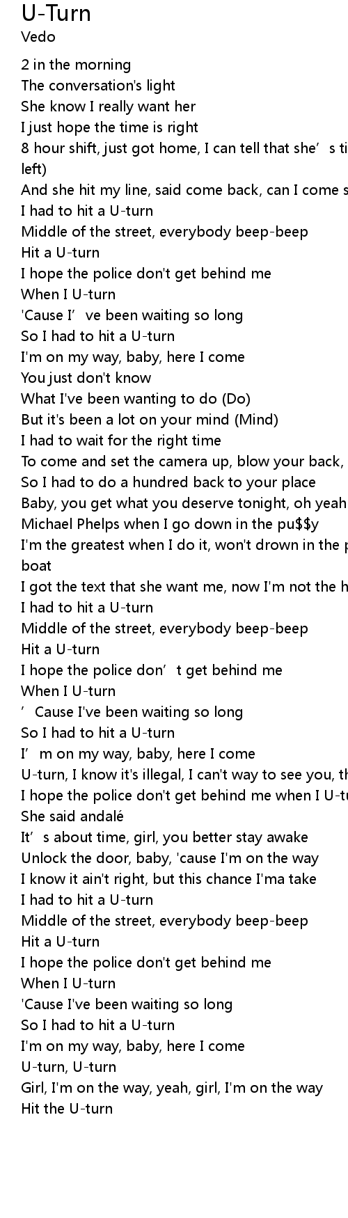 | [01:45.339] | U-turn, I know it's illegal, I can't way to see you, this U-turn |