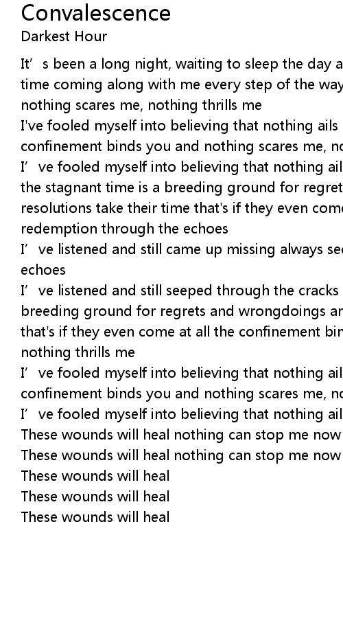 | I' ve fooled myself into believing that nothing ails me, nothing can kill me the stagnant time is a breeding ground for regrets and wrongdoings and resolutions take their time that' s if they even come at all always seeking redemption through the echoes | |