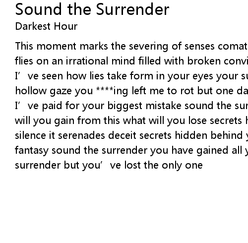 | I’ve paid for your biggest mistake sound the surrender embraced in vain what will you gain from this what will you lose secrets hidden behind your back your silence it serenades deceit secrets hidden behind your back your forever ideal fantasy sound the surrender you have gained all you could from this sound the surrender but you’ve lost the only one |