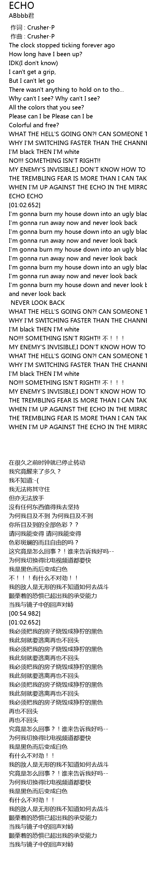 | [00:51.457] | WHEN I'M UP AGAINST THE ECHO IN THE MIRROR |