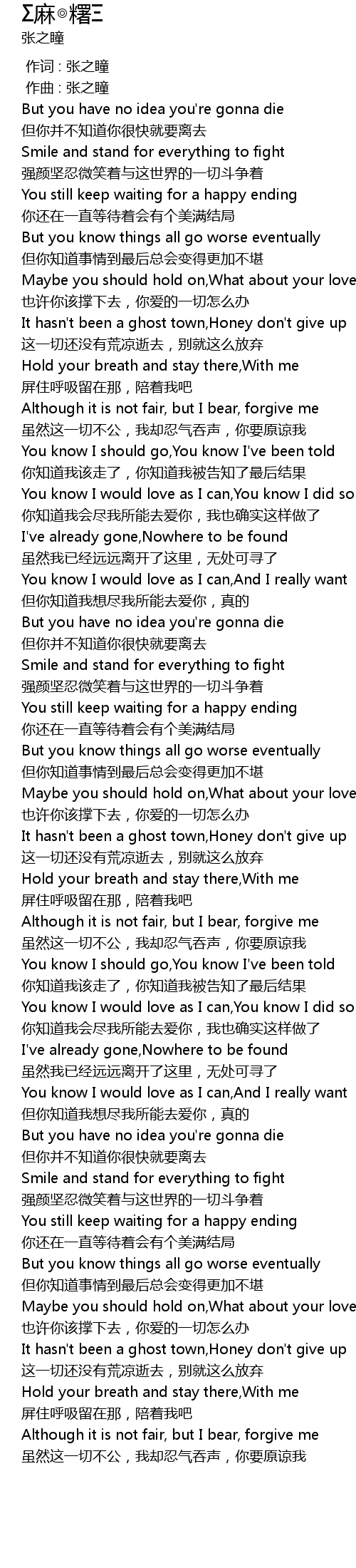 | [00:30.391] | But you have no idea you' re gonna die dàn nǐ bìng bù zhī dào nǐ hěn kuài jiù yào lí qù |