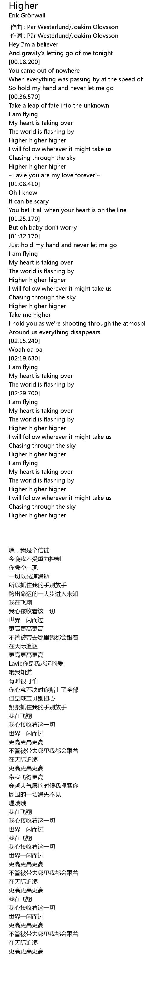 | [02:03.380] | 带我飞得更高 |