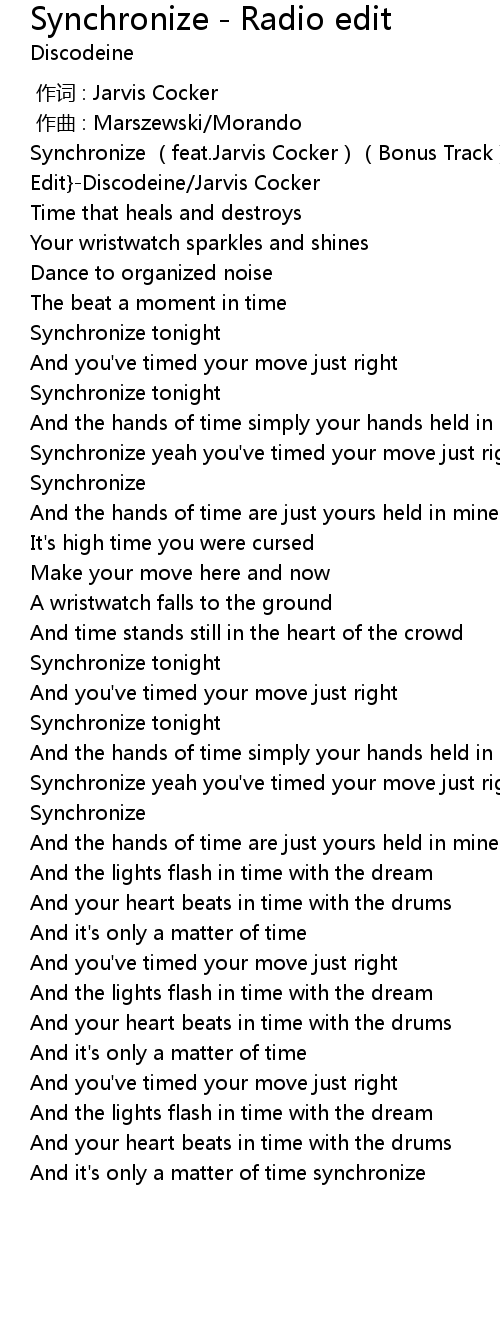 | [00:00.817] | Synchronize feat. Jarvis Cocker Bonus Track Radio Edit Discodeine Jarvis Cocker |