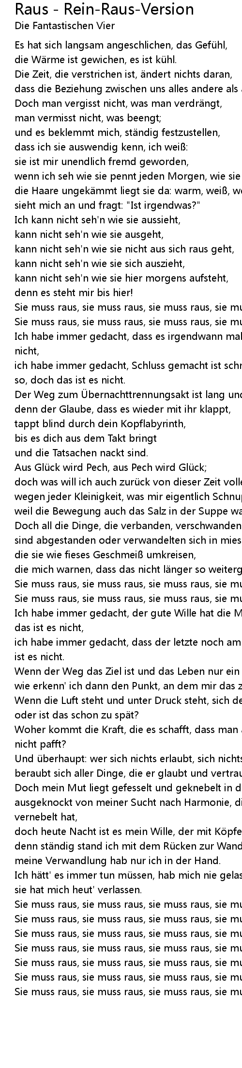 | Sie muss raus, sie muss raus, sie muss raus, sie muss geh' n | |