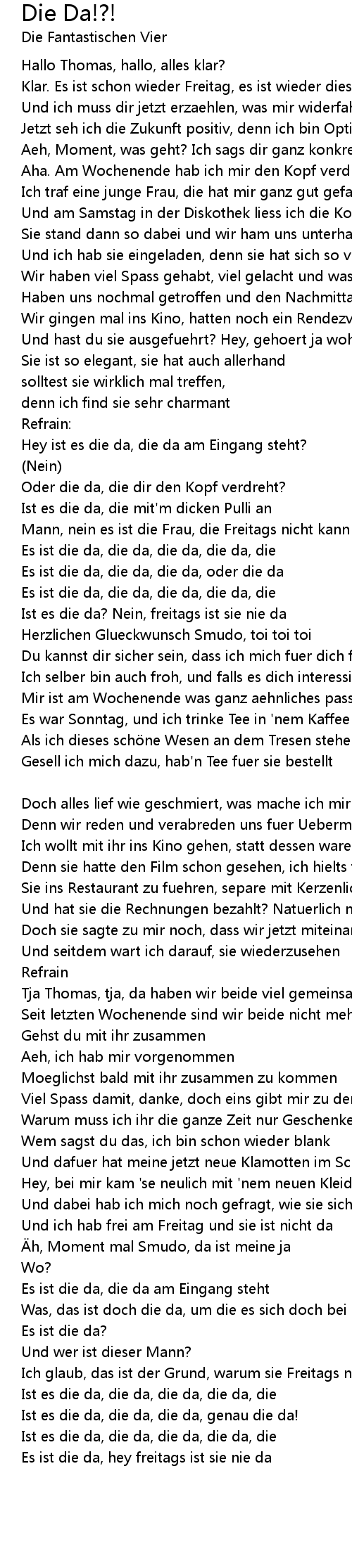 | Ist es die da, die da, die da, genau die da! | |