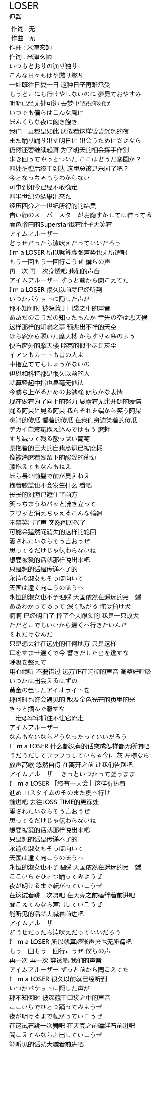 | [02:33.035] | I ' m a LOSER shén me dōu méi yǒu de huà biàn chéng zěn yàng dōu wú suǒ wèi ba |
