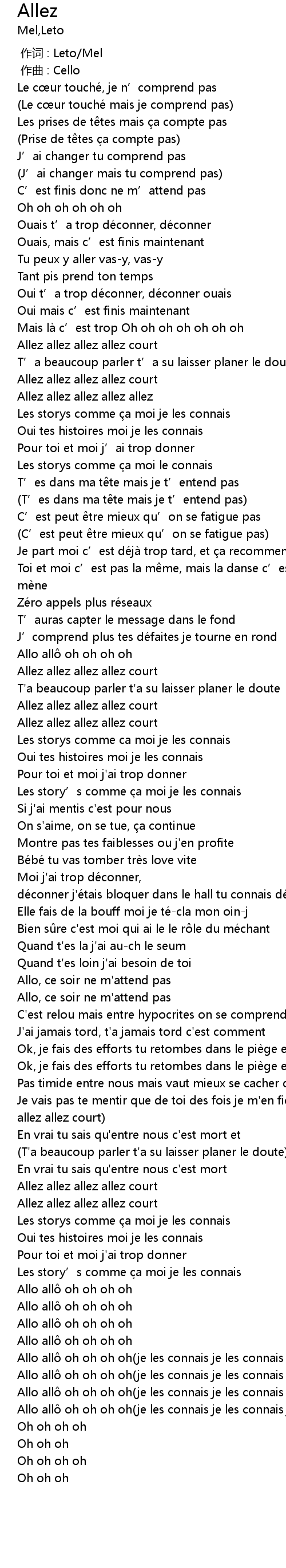 | [02:48.60] | Je vais pas te mentir que de toi des fois je m'en fiche(Allez allez allez allez court) |