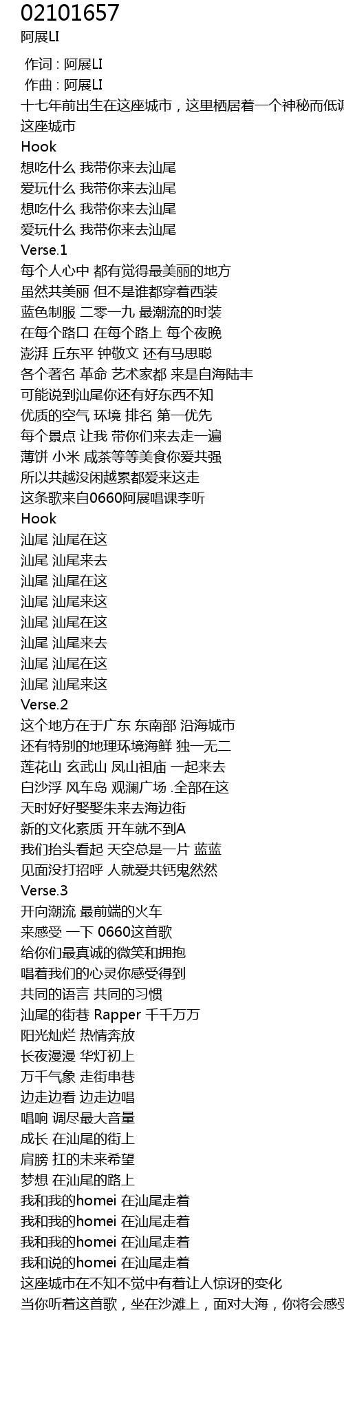 | [02:43.556] | 汕尾的街巷 Rapper 千千万万 |