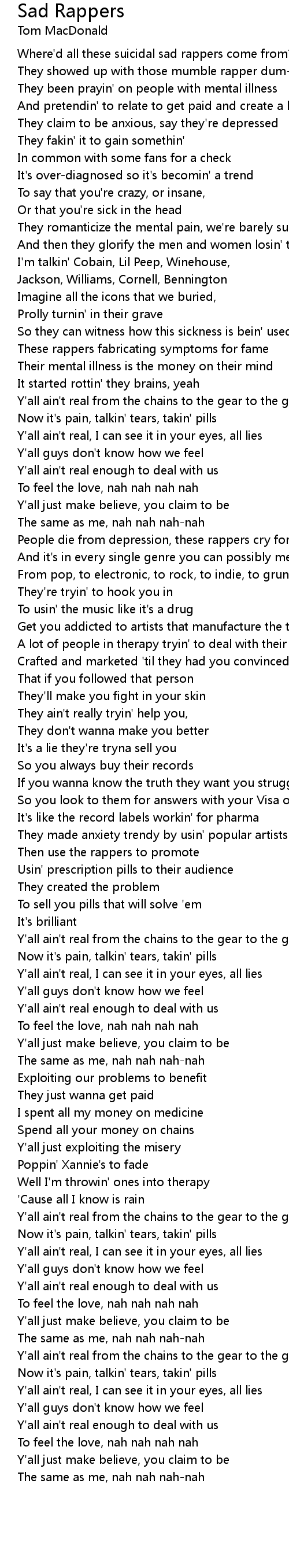 Now it's pain, talkin' tears, takin' pills |