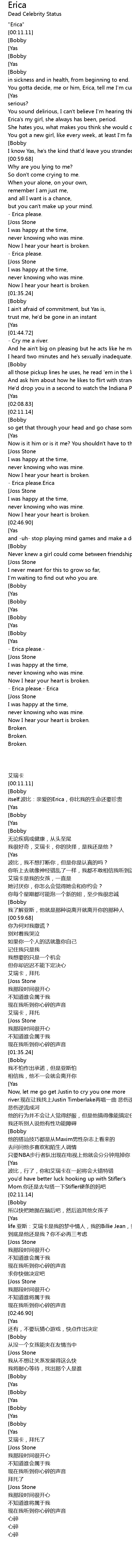 | [02:11.69][Bobby] | 波比:听着,艾瑞卡是我的灵魂伴侣,我的命中注定之人,我的整个世界 |