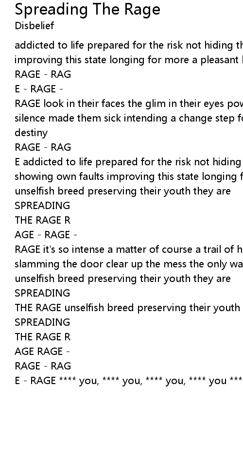 RAGE it's so intense a matter of course a trail of hope exeptional stream slamming the door clear up the mess the only way to feed their common dream unselfish breed preserving their youth they are |