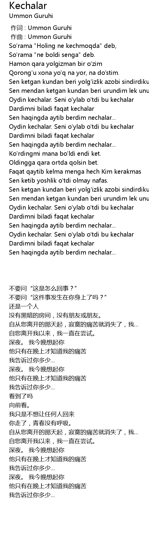 | [02:25.901] | Sen ketgan kundan beri yolg' izlik azobi sindirdiku meni... |
