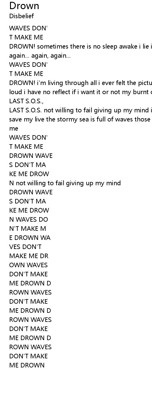 DROWN! i'm living through all i ever felt the pictures in my head the words so loud i have no reflect if i want it or not my burnt out soul sends me a sign |