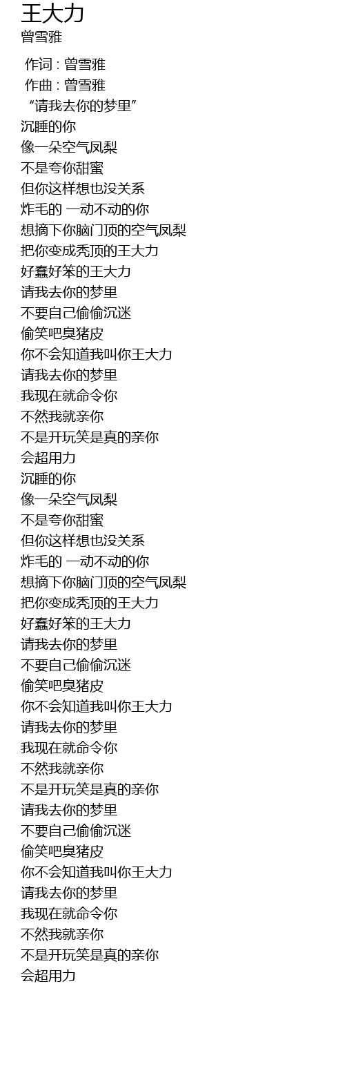 | [02:23.632] | 你不会知道我叫你王大力 |