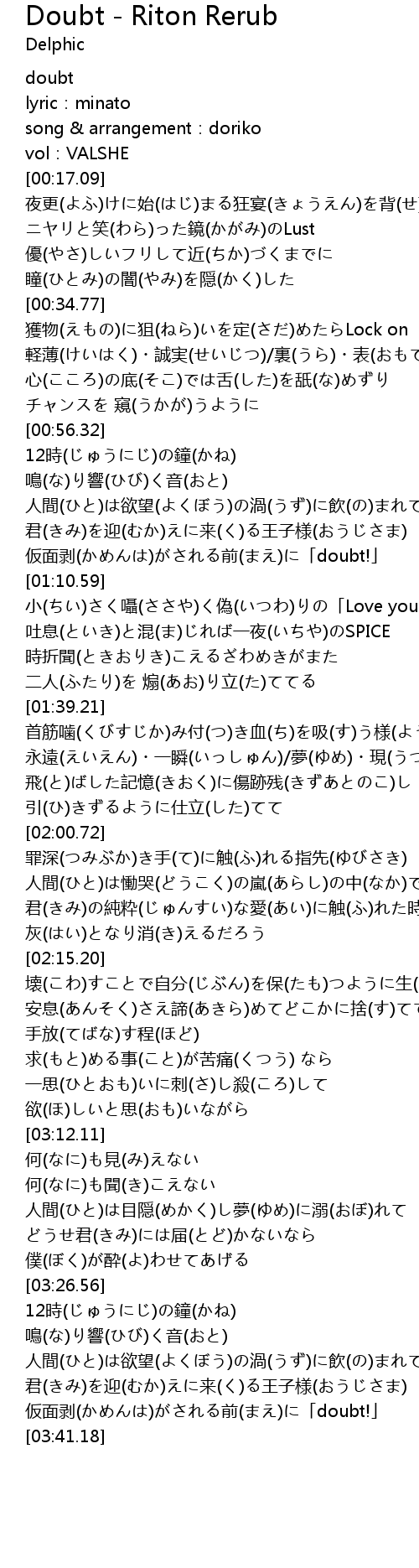| [03:37.54] | 仮面剥(かめんは)がされる前(まえ)に「doubt!」 |