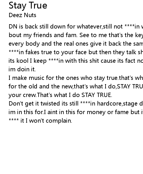| I make music for the ones who stay true.that's what I do,STAY TRUE.I make music for the old and the new,that's what I do,STAY TRUE. I make music for you and your crew.That's what I do STAY TRUE. | |