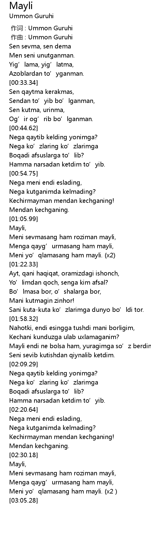| [02:58.24] | Meni yo' qlamasang ham mayli. x2 |