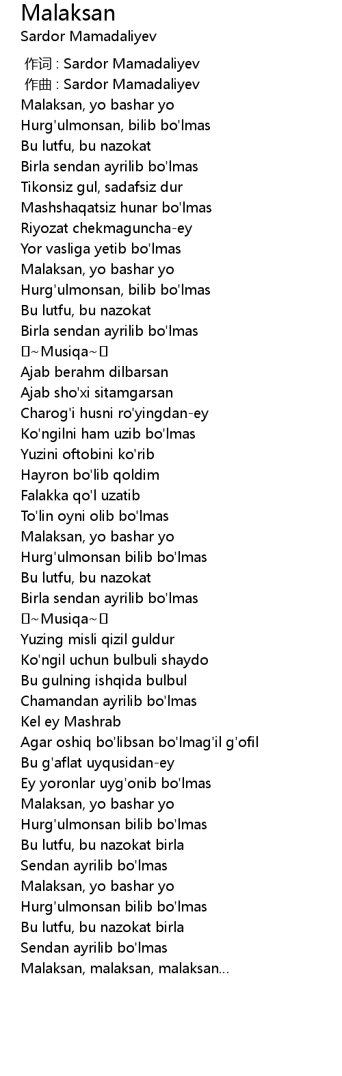 | [00:00.000] | 作词 : Sardor Mamadaliyev |