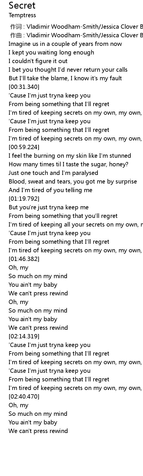 | [02:33.912] | I'm tired of keeping secrets on my own, my own, my own |