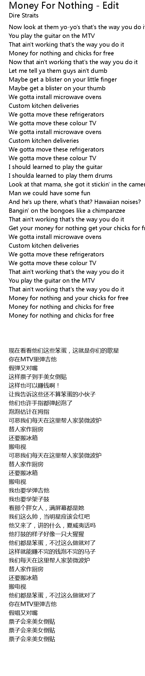 Get your money for nothing get your chicks for free |