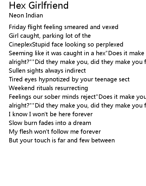 Seeming like it was caught in a hex"Does it make you, does it make you feel alright?""Did they make you, did they make you feel alright?" |