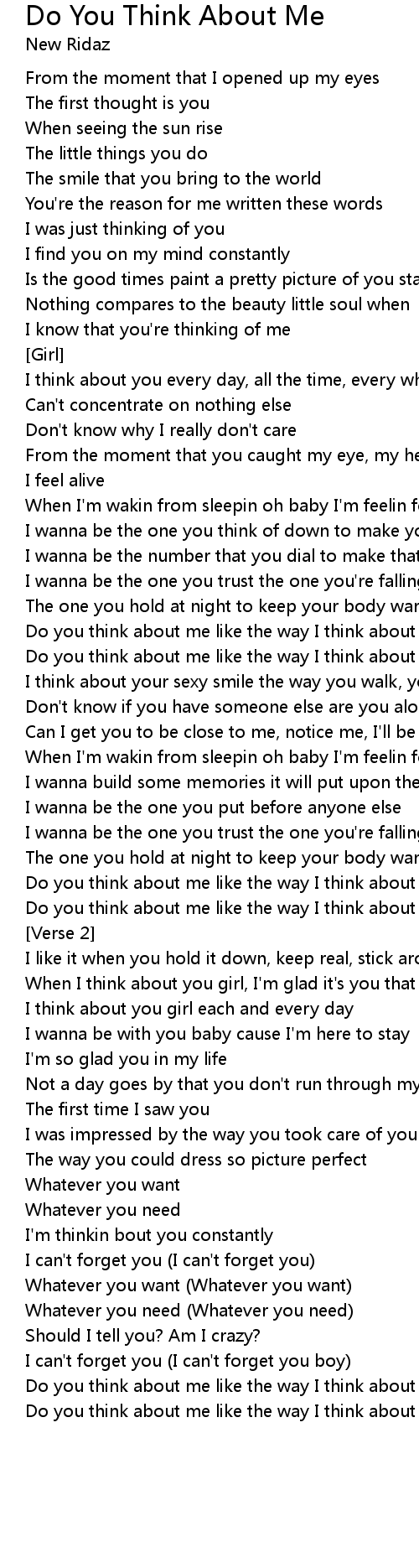 | I think about your sexy smile the way you walk, your big brown eyes | |