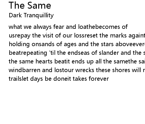 | [music: Brandstrom, Jivarp, Henriksson]what we always fear and loathebecomes of usrepay the visit of our lossreset the marks againthe turning pointseems to be holding onsands of ages and the stars aboveeverchanging as the same hearts beatrepeating 'til the endseas of slander and the soil we walkeverchanging as the same hearts beatit ends up all the samethe sail that never knew the windbarren and lostour wrecks these shores will never reacha trek on darker trailslet days be doneit takes forever |