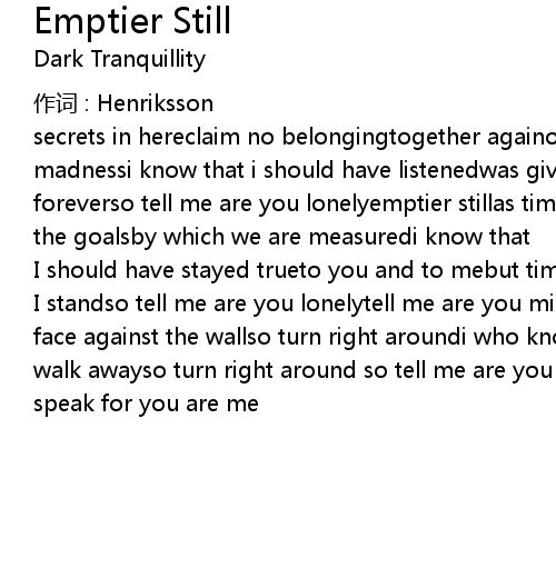 | [music: Henriksson]secrets in hereclaim no belongingtogether againor send me to madnessi know that i should have listenedwas given a choice i turned down foreverso tell me are you lonelyemptier stillas time takes us fartheraway from the goalsby which we are measuredi know that | |