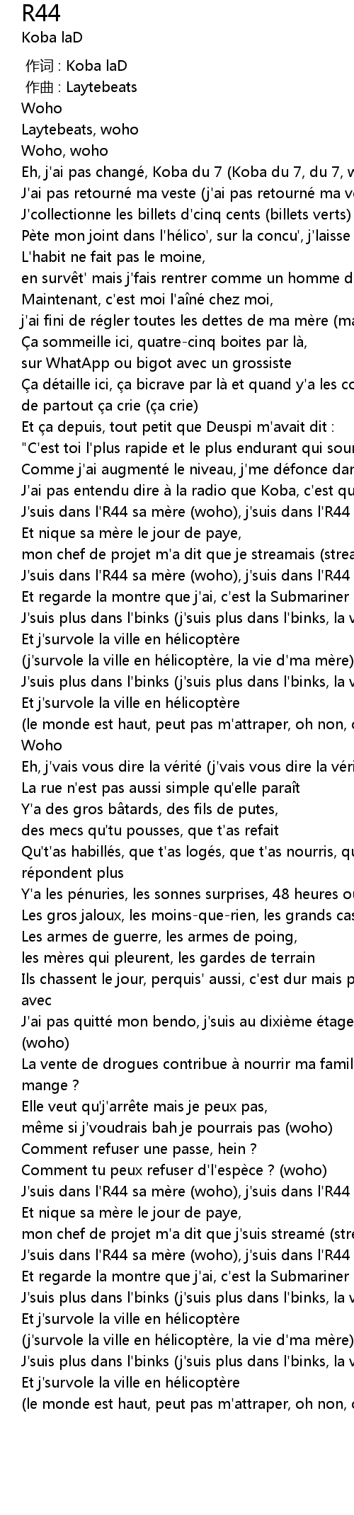 | [00:59.17] | J'suis dans l'R44 sa mère (woho), j'suis dans l'R44 sa mère (woho) |