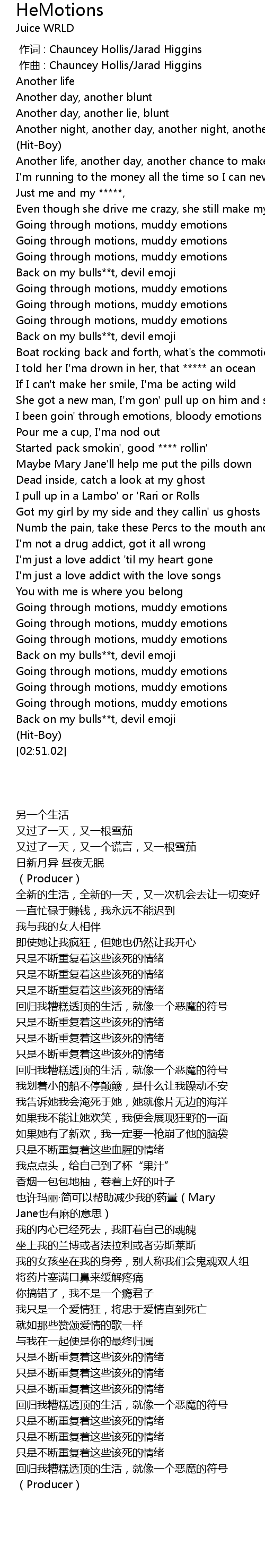 | [01:07.12] | I been goin' through emotions, bloody emotions |
