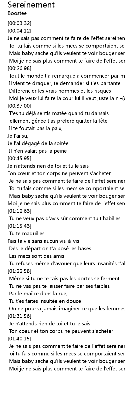 | [01:08.38] | Moi je ne sais plus comment te faire de l' effet sereinement |