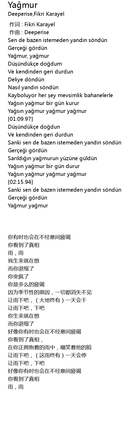 | [00:59.86] | Yağsın yağmur yağmur yağmur |
