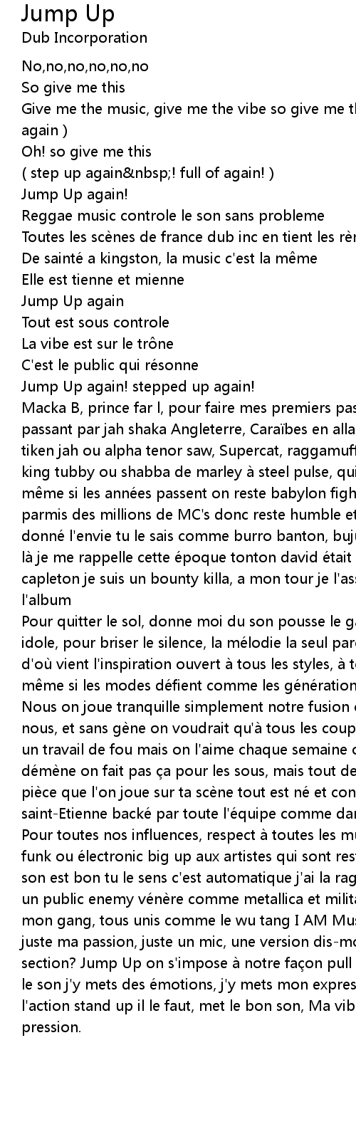 | Pour toutes nos influences, respect à toutes les musiques du rock au hip hop, funk ou é lectronic big up aux artistes qui sont resté s authantiques quand le son est bon tu le sens c' est automatique j' ai la rage contre la machine, je suis un public enemy vé nè re comme metallica et militant comme fé la je rste kool ac mon gang, tous unis comme le wu tang I AM Musical Youth and a riddim rida C' est juste ma passion, juste un mic, une version dismoi où on installe toute la section? Jump Up on s' impose à notre fa on pull up lorsqu' on fait pé ter tout le son j' y mets des é motions, j' y mets mon expression le temp de passer à l' action stand up il le faut, met le bon son, Ma vibration fait baisser la pression. |