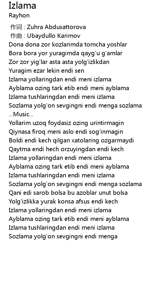 | [00:00.000] | 作词 : Zuhra Abdusattorova |