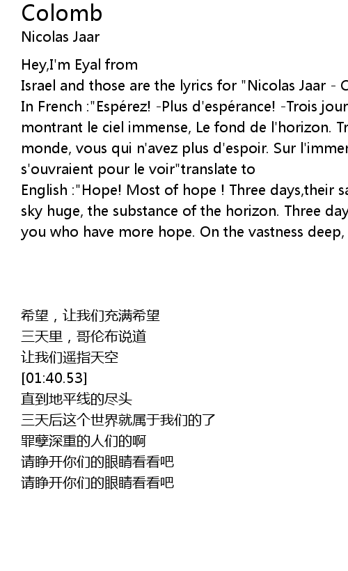 | Israel and those are the lyrics for " Nicolas Jaar Colomb" : | |