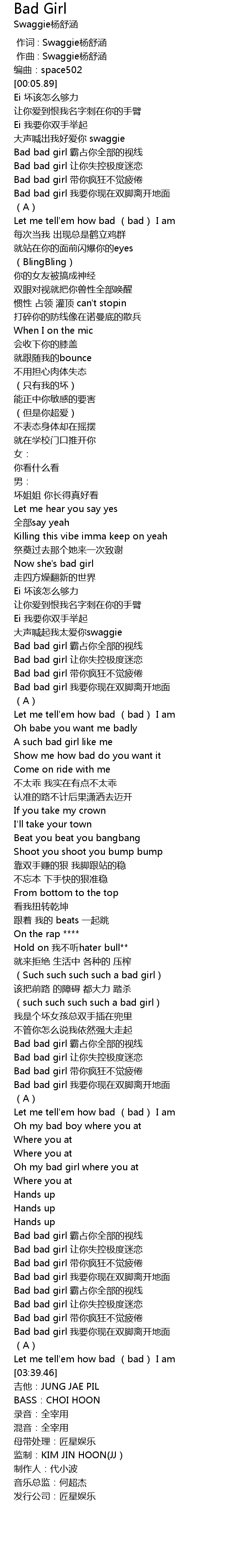 | [02:56.61] | Bad bad girl wo yao ni xian zai shuang jiao li kai di mian |