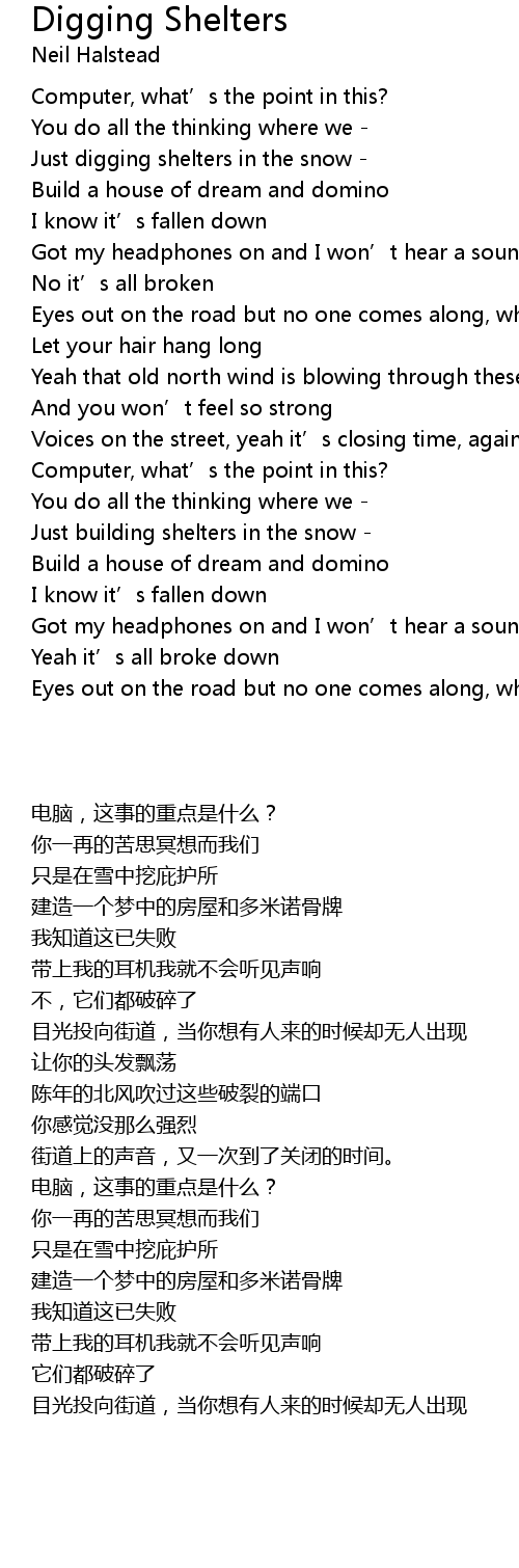 | [00:36.89] | Just digging shelters in the snow |