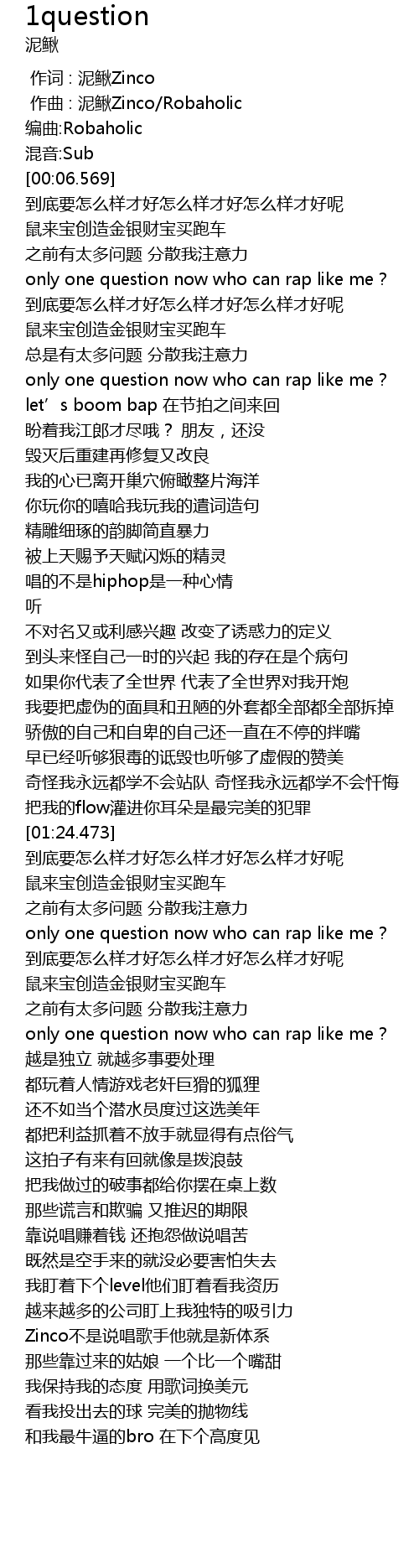 | [00:01.000] | zuò qǔ : ní qiū Zinco Robaholic |