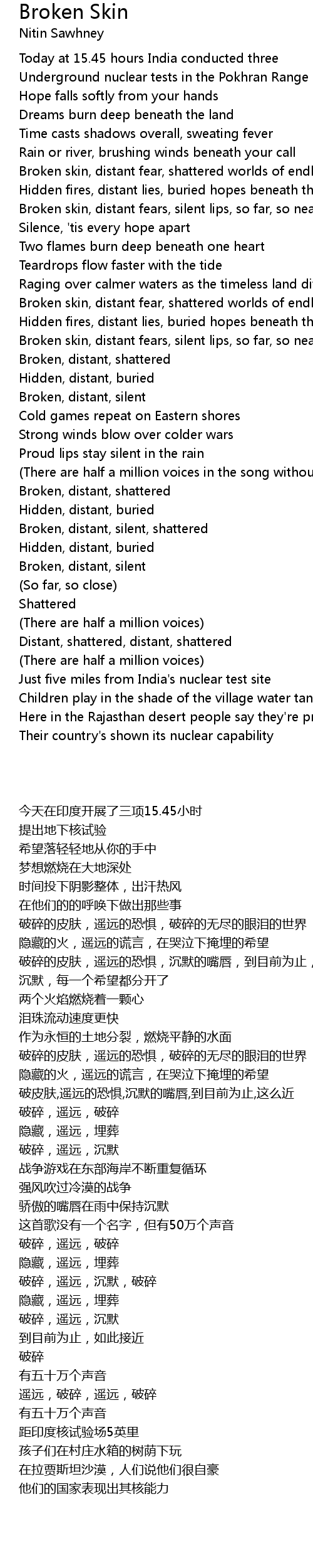 Broken skin, distant fears, silent lips, so far, so near |